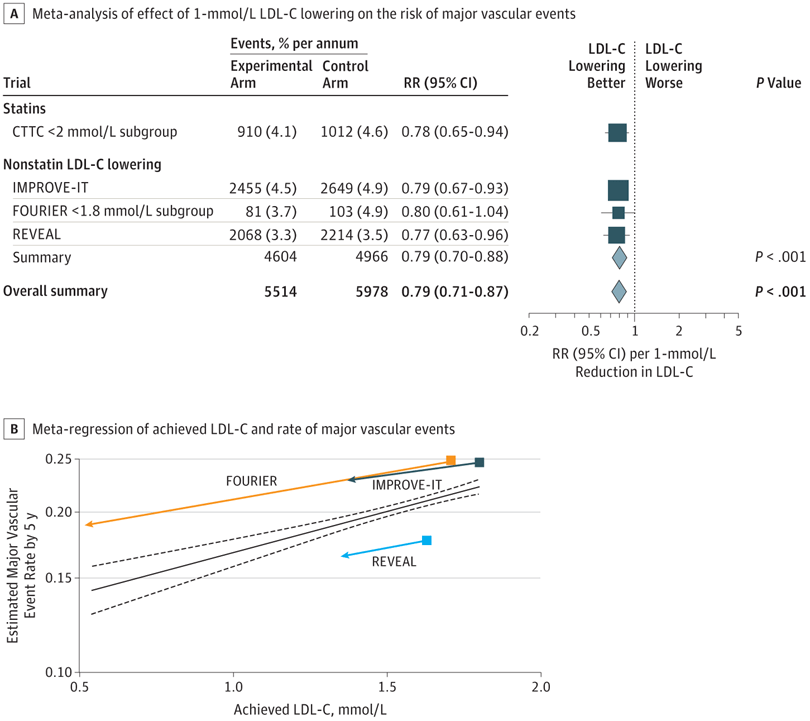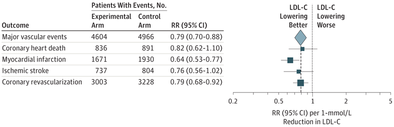 Nonstatin therapy lowered LDL-C by 11 mg/dL to 45 mg/dL, and the RR for major vascular events per 38.7-mg/dL reduction in LDL-C was 0.79 (95% CI, 0.70-0.88)